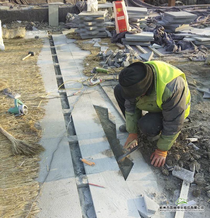 “白天溫度在零度以上時(shí),我們趁著太陽出來、溫度比較高的時(shí)候施工;等太陽快下山時(shí),溫度下降很快,這時(shí),我們就停止施工,用毛氈、草墊等將做好的鋪裝蓋起來,再搭上保濕棚保溫。因?yàn)槿绻E胧┳霾坏轿?,白天做好的鋪裝,晚上就會(huì)凍壞,導(dǎo)致白天的工作功虧一簣。一些種好的精品樹木,如造型黑松,我們就用很厚的棉被包裹起來,以防凍傷?!被貞浧甬?dāng)初的施工過程,吳小成依然覺得這是施工中一段時(shí)常難熬的時(shí)期,“零下15℃的時(shí)候,我們還在施工,此時(shí)水已經(jīng)全部結(jié)冰,但施工又離不開水,怎么辦呢?我們買了一個(gè)加熱器,把冰放到桶里,再把桶加溫化水,以此來滿足施工中的用水需求。”